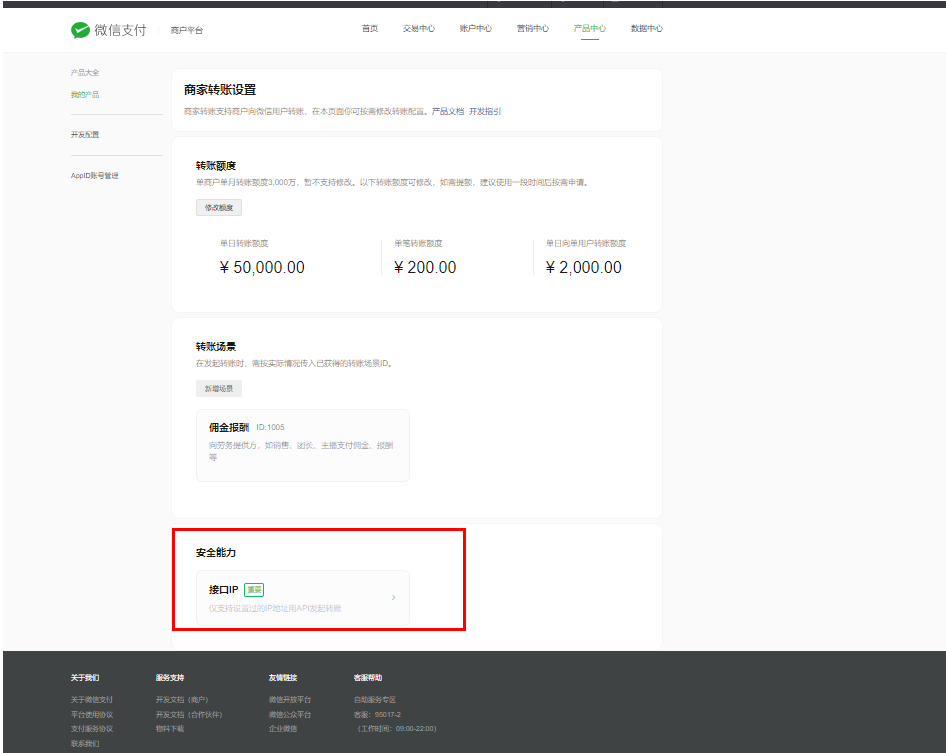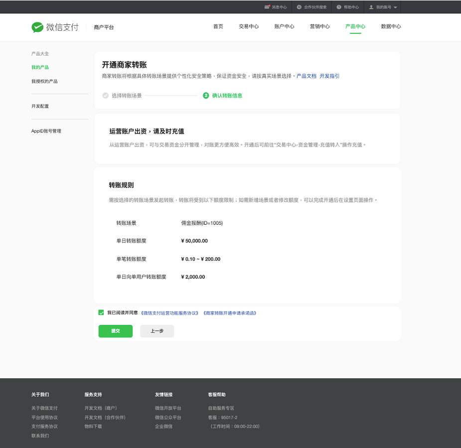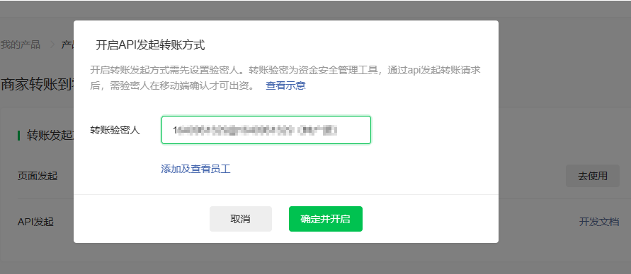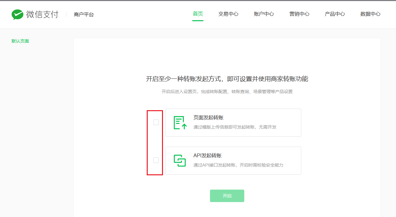 ① 完成提审后,进入商家转账能力的设置页面,勾选“页面发起方式”和“api发起转账”,点击确认开启