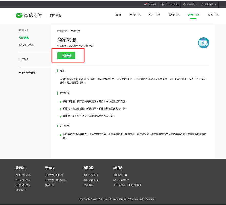 在教育产品中,如果使用了推广员功能功能,并且佣金结算方式选择了“系统自动结算”,则需要开通“ 商家转账”功能。