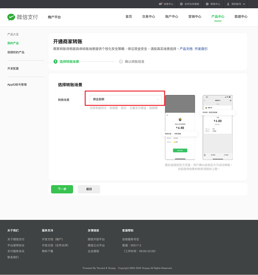 ③ 按下图所示,选择 “转账场景:佣金报酬“,然后点击下一步
