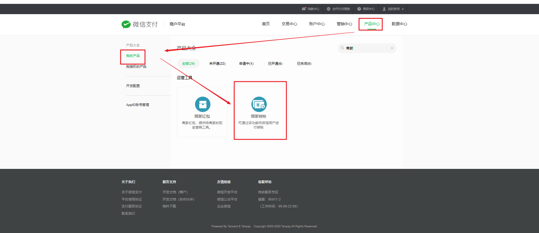 ① 登录进去之后,按照路径:“k8凯发官网入口的产品中心-我的产品-运营工具”找到“商家转账”功能。