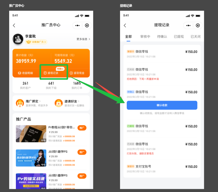② 商家后台通过申请后,推广员须在24小时内于推广员中心的【提现记录】确认(如下图),否则款项自动退回,如需提现需重新申请 。