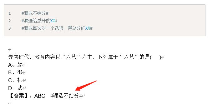 文本导入模板中,多选题,在答案后面通过“##”来包裹漏选规则;