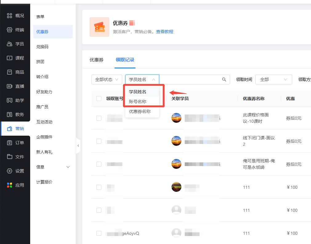 优惠券领取记录列表:新增“学员姓名”、“账号名称”查询;