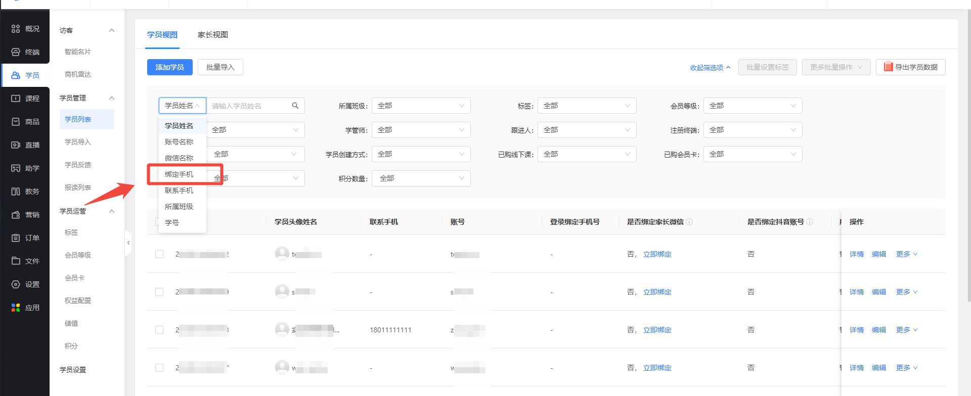 学员列表:新增“绑定手机号”查询;
