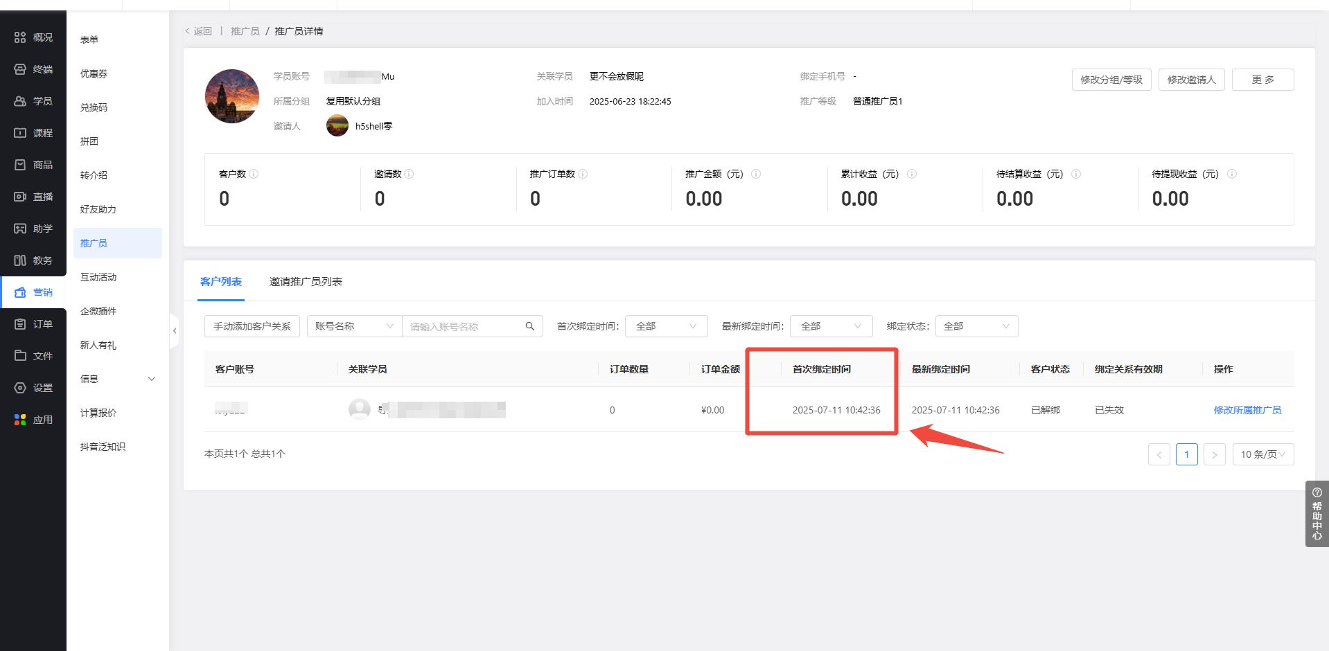 了解推广员首次绑定此客户时间