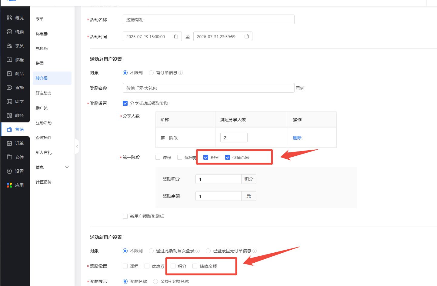 转介绍/邀请有礼,结合积分和储值的营销玩法