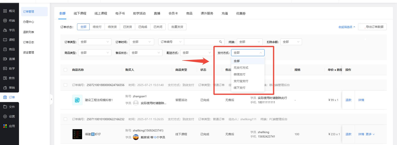 订单列表:新增“k8凯发官网入口的支付方式”筛选项