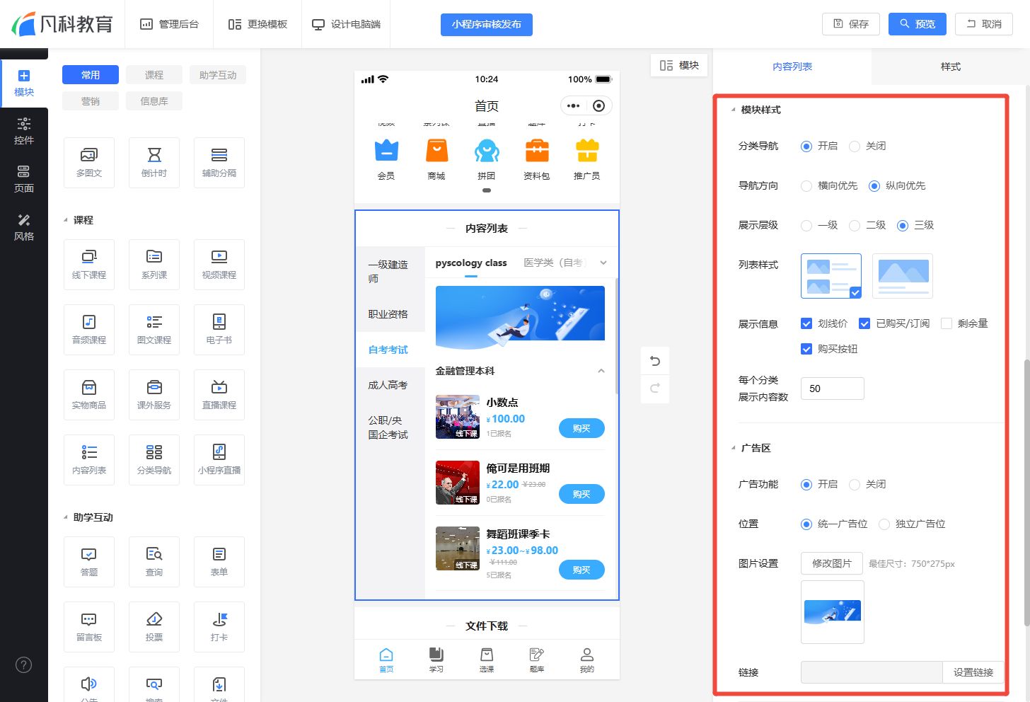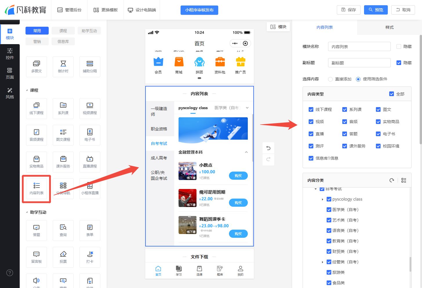 支持模块层级的内容聚合及分类导航展示,丰富学员端搭建效果