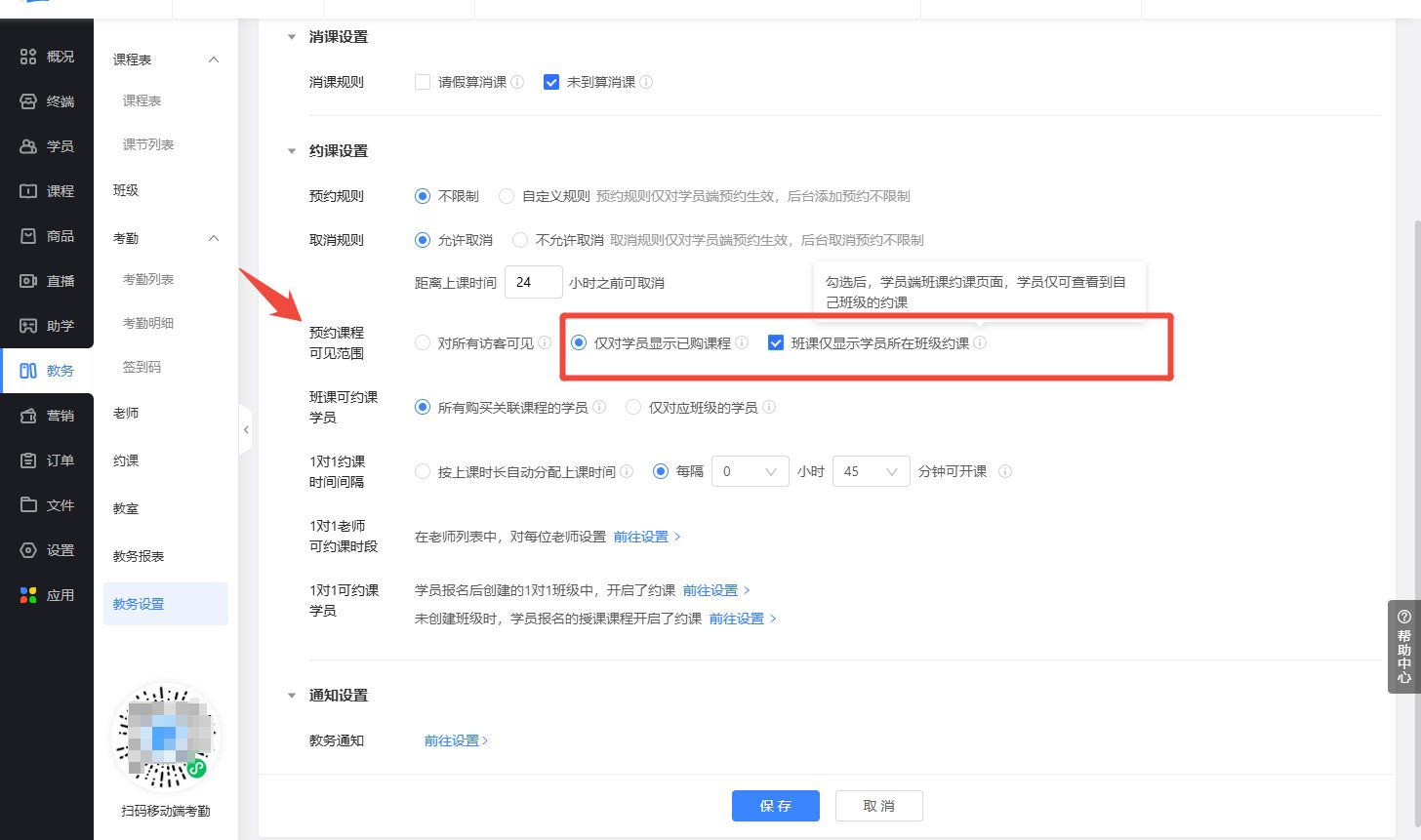 1.如下图,针对班课约课,新增“班课仅显示学员所在班级约课”复选框设置,进一步缩小约课可见范围。