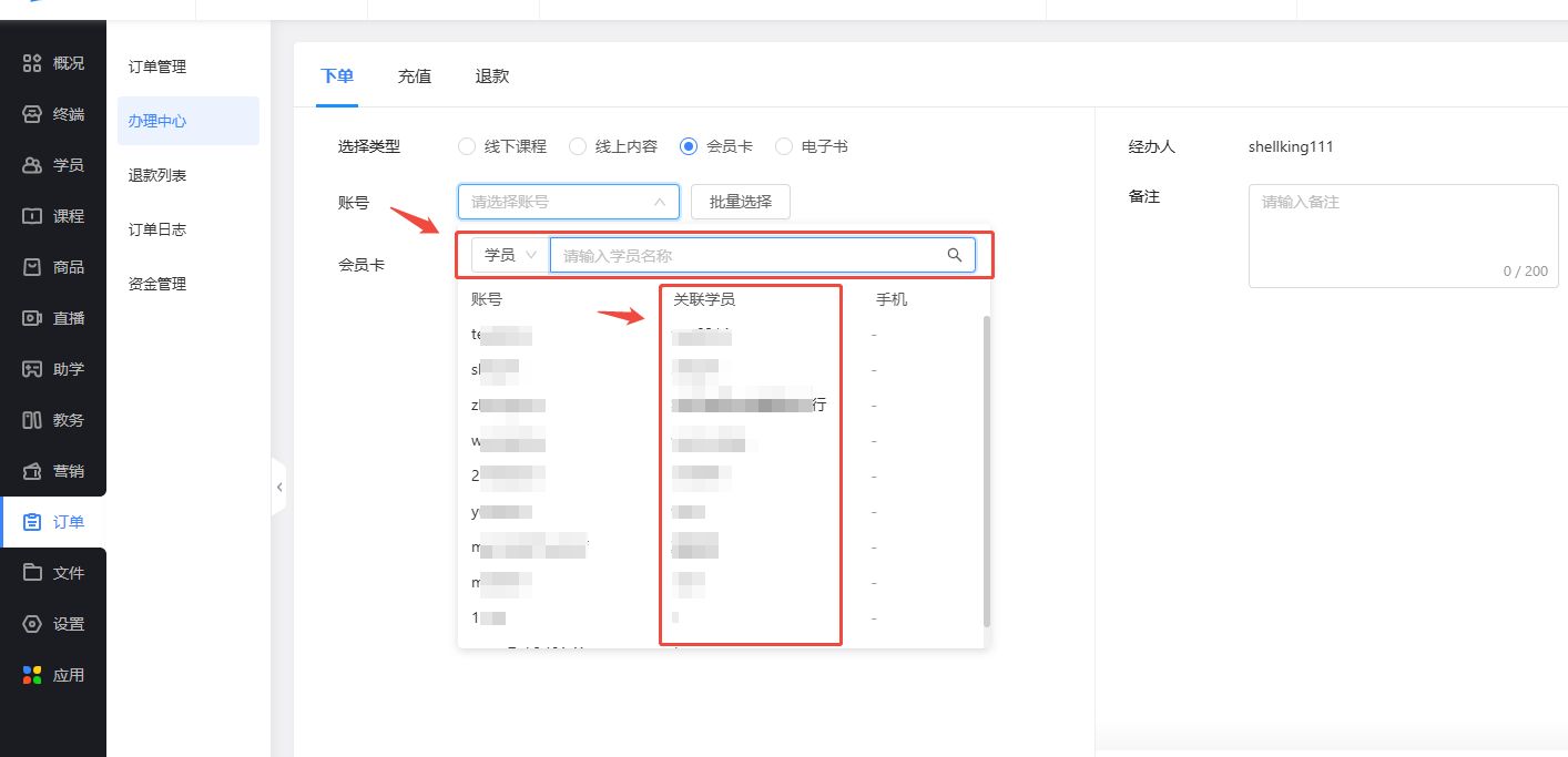 账号选择下拉列表新增“关联学员”字段。显示关联学员姓名
