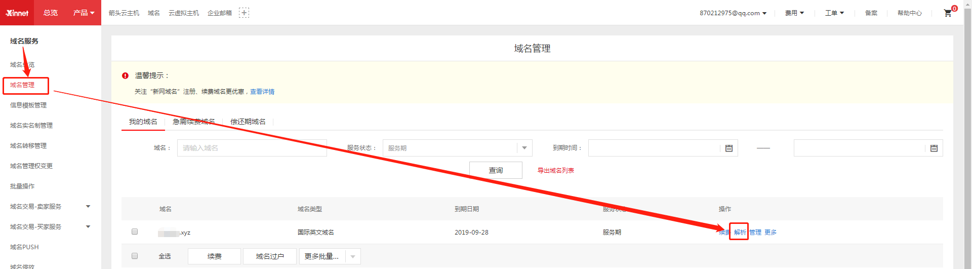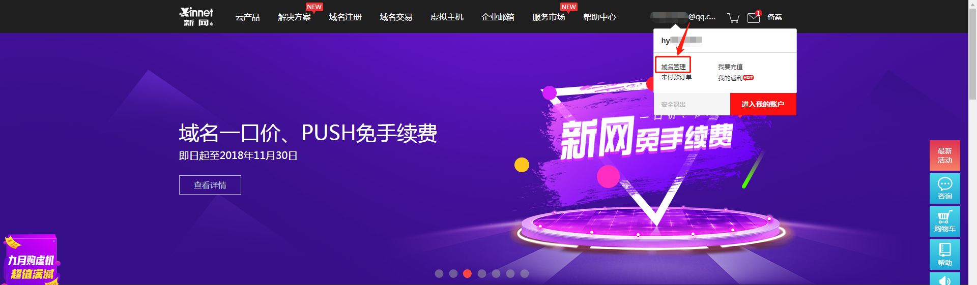 登录新网账号,点击右上角的【账号名--域名管理】进入域名总览页。录