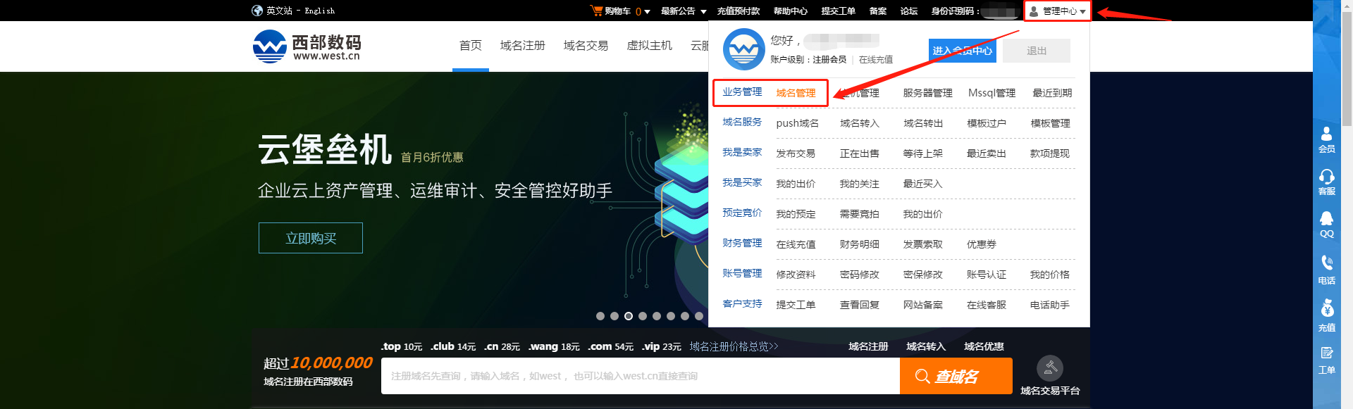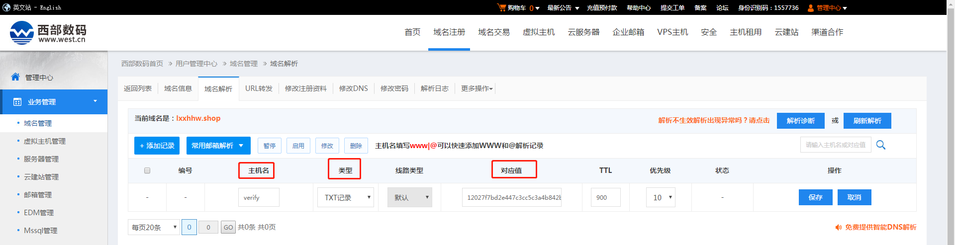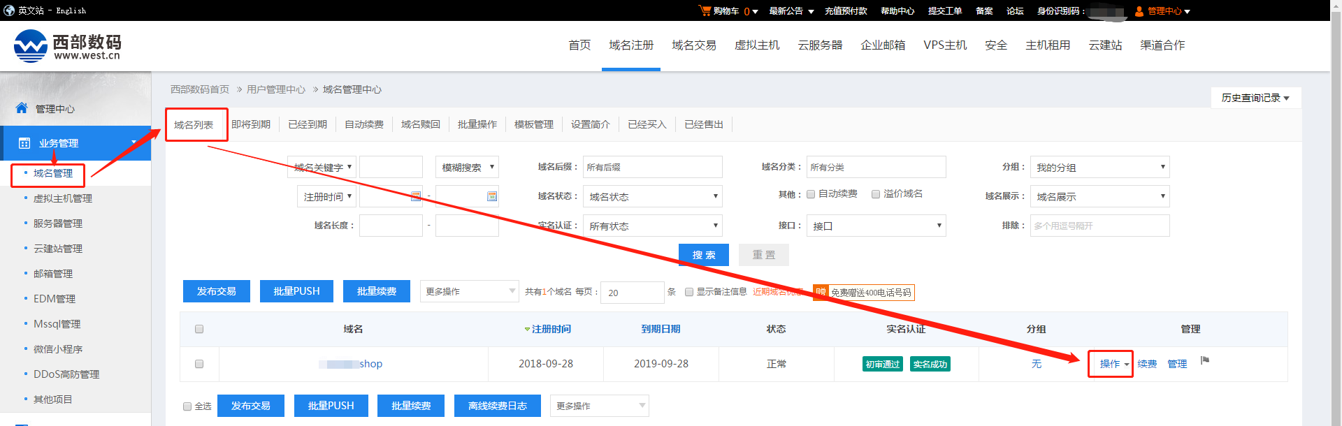 登录进入西部数码的【管理中心--业务管理--域名管理】页面中。录