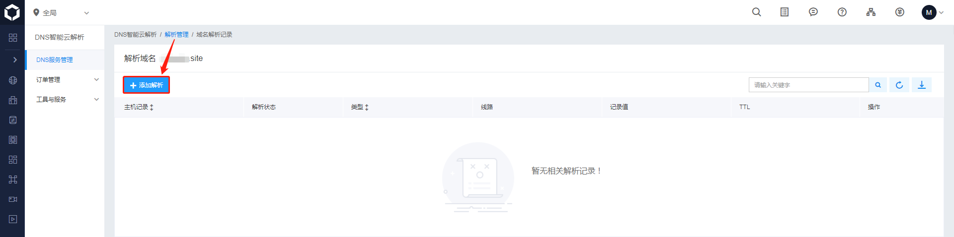 进入【域名管理-域名列表】中,点击要绑定到凡科上的域名的【操作】按钮,选择【解析】,进入域名解析页面。