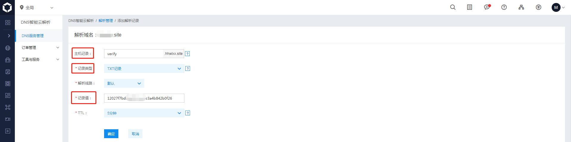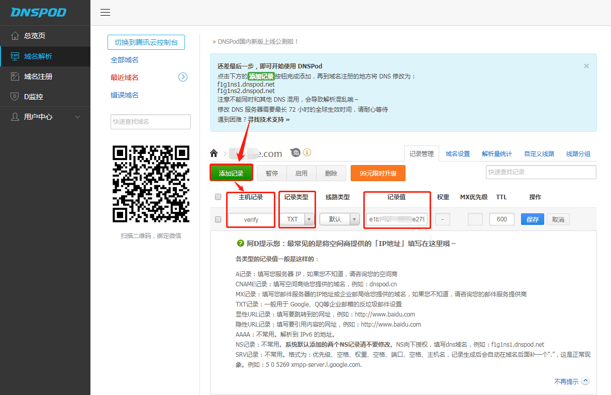 点击【添加记录】,输入凡科网站管理后台【网站域名-绑定外部域名】中提供的记录类型、主机记录、记录值。
