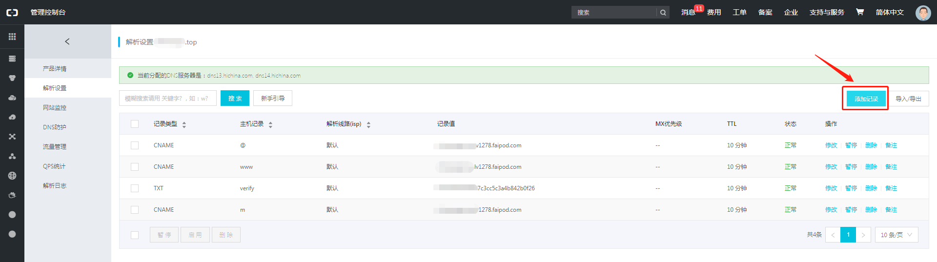 进入管理控制台后,点击进入【域名解析】,再点击要绑定到凡科上的域名,进入域名解析页面。