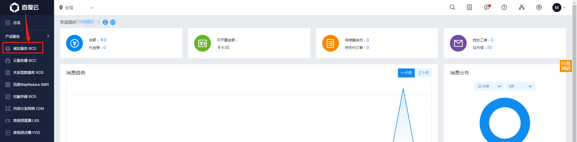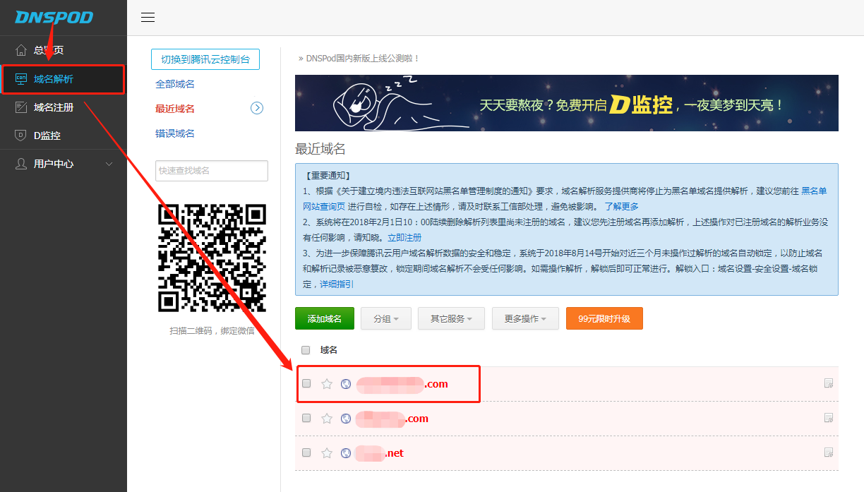 点击左侧导航栏的【域名】,进入【域名列表】。
