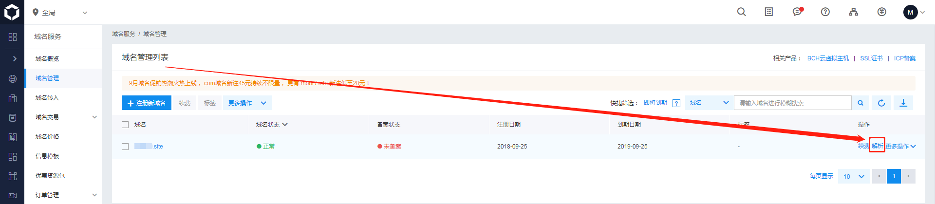 进入域名总览页面后,进入【域名管理】,点击要绑定到凡科上的域名的【解析】按钮。