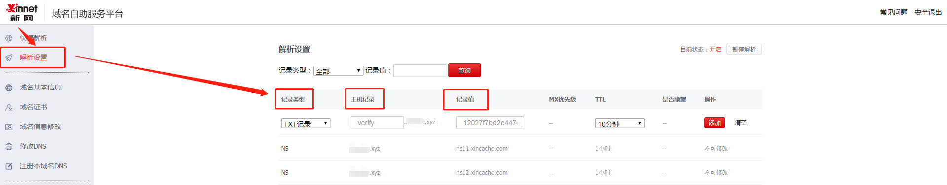 点击左侧的【解析设置】,进入解析设置页面,输入凡科网站管理后台【网站域名-绑定外部域名】中提供的记录类型、主机记录、记录值。