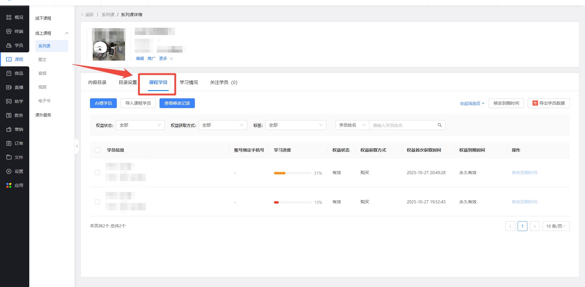 一、【线上课】支持显示课程学员及修改到期时间(内测)