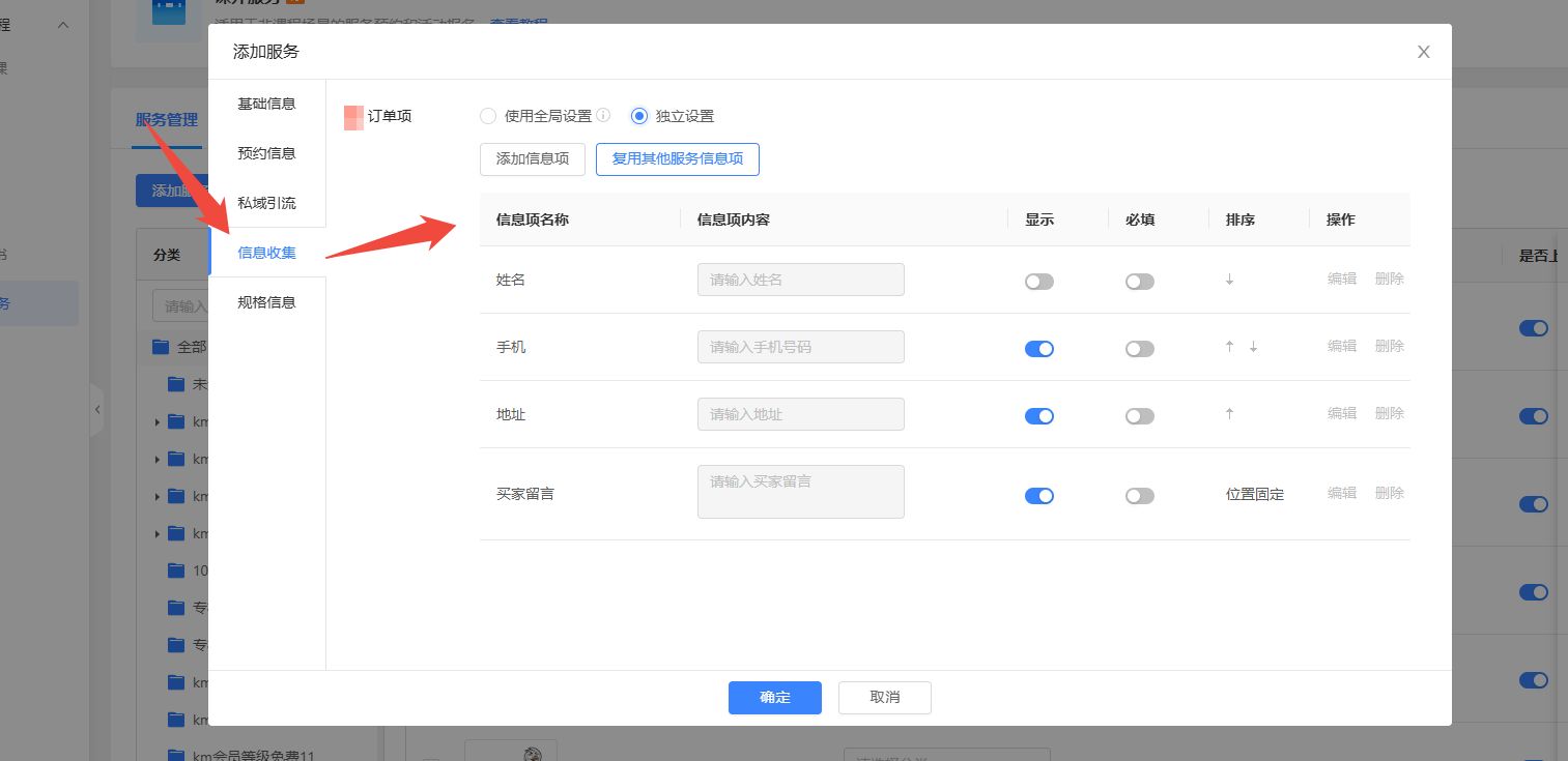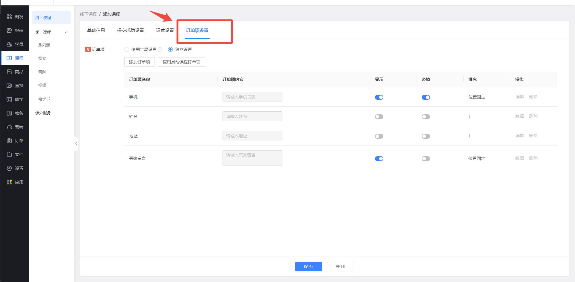 不同线下课、实物商品、课外服务需单独设置收集的订单项信息