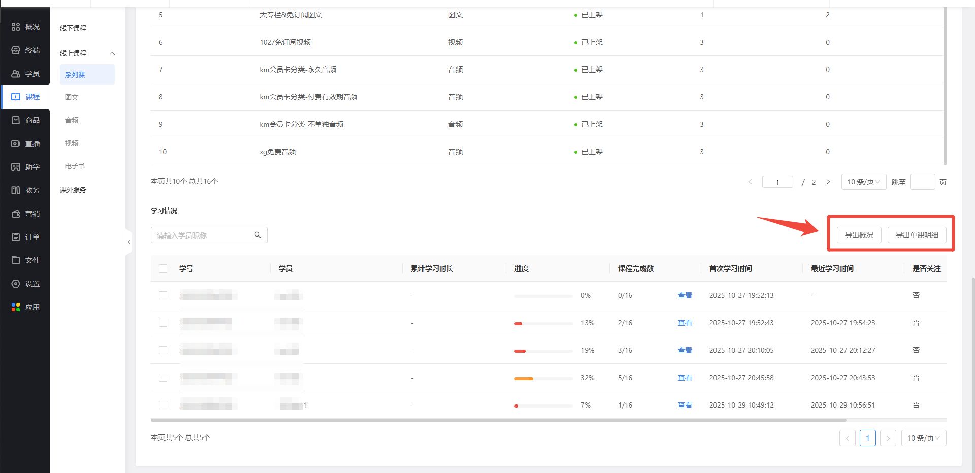 五、【线上课】系列课单课学习明细支持合并导出