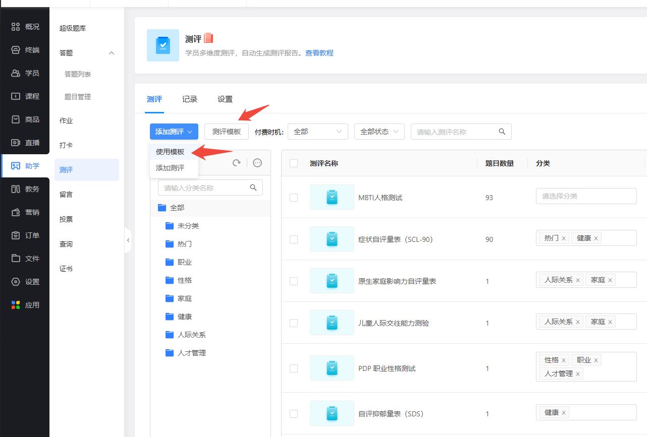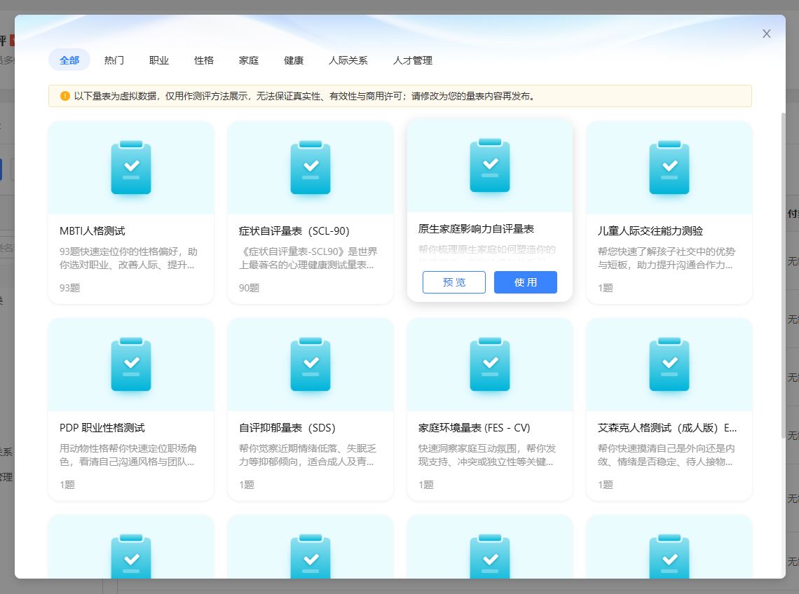 2、支持丰富的测评模板,一键使用模板,实现快速创建和上线测评活动;