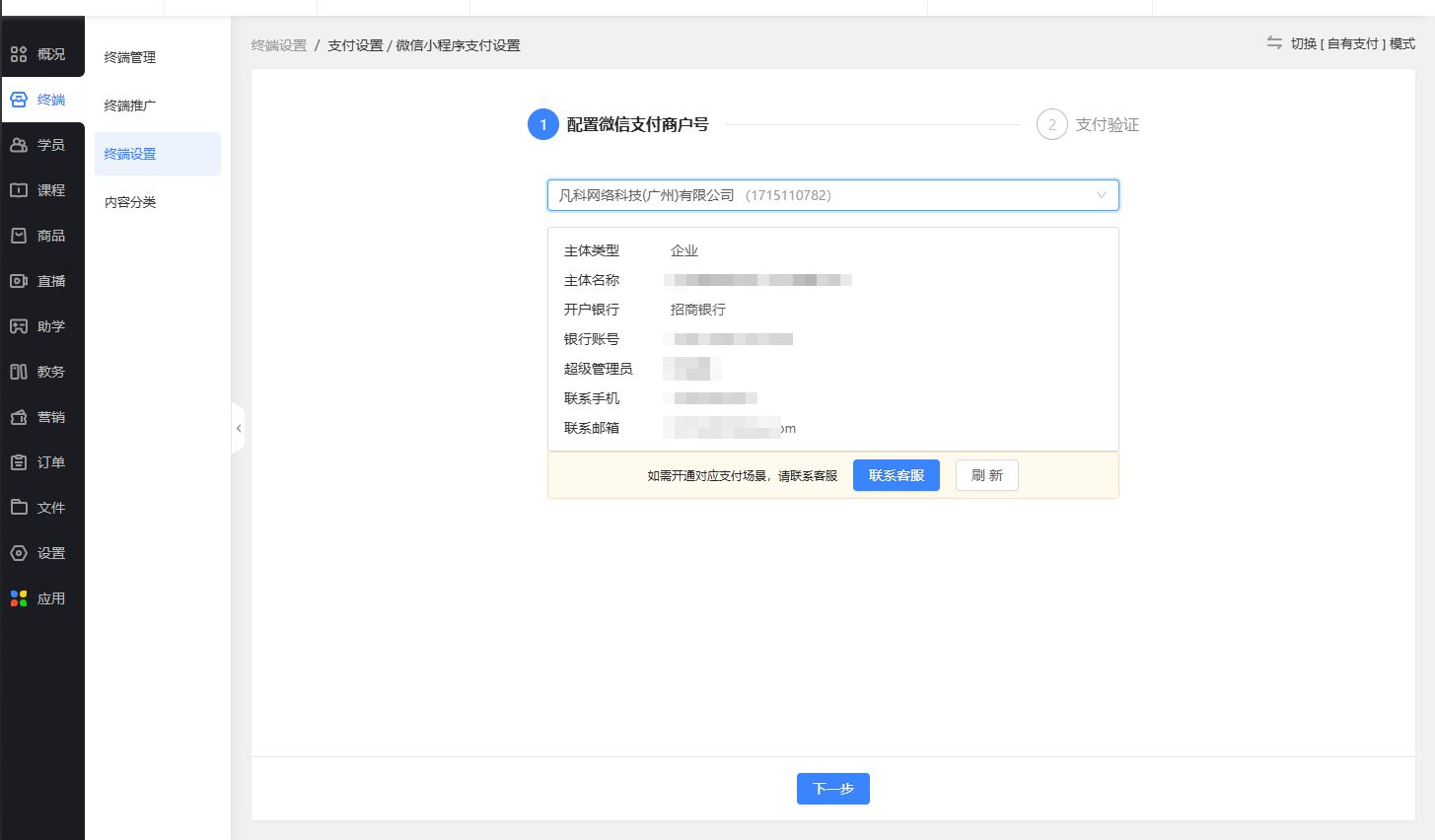 跨终端配置微信直连支付时,可以选择同一个商户号,若提示未开通支付场景,联系客服操作开通即可