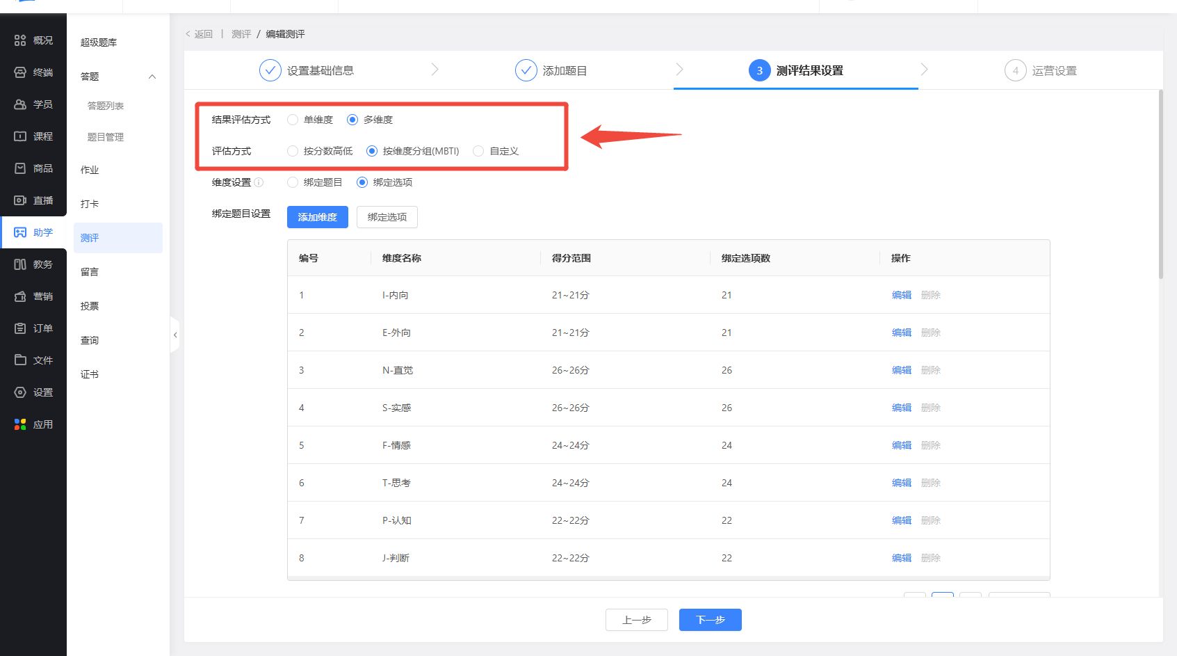 【按维度分组】可以将维度分组,组内ab维度做比较,实现mbti等以维度方向进行结果评估的测评类型;