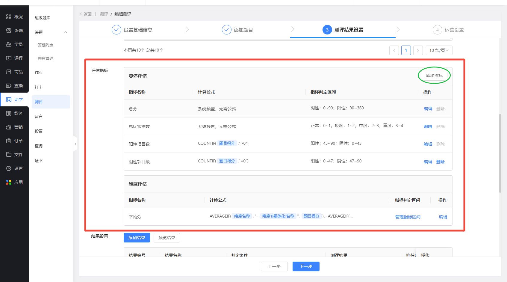 【自定义】方式下,可以自定义评估指标,指标可以自定义指标计算公式、指标的评估区间等,做到更加个性化的自定义测评;满足scl-90、艾克森等综合型测评场景