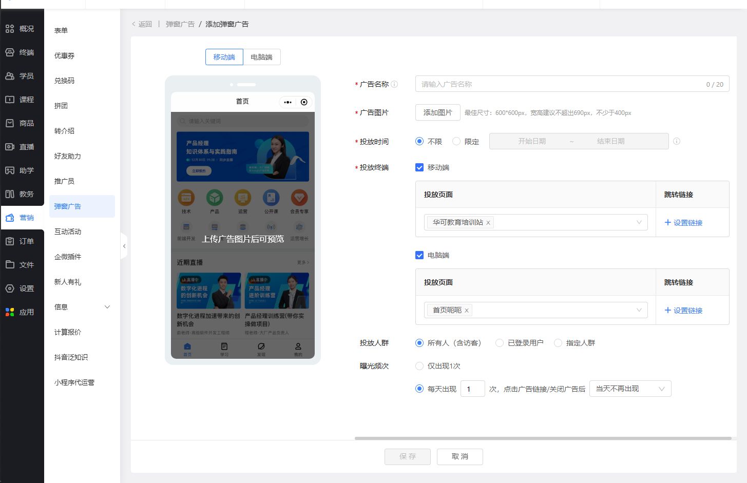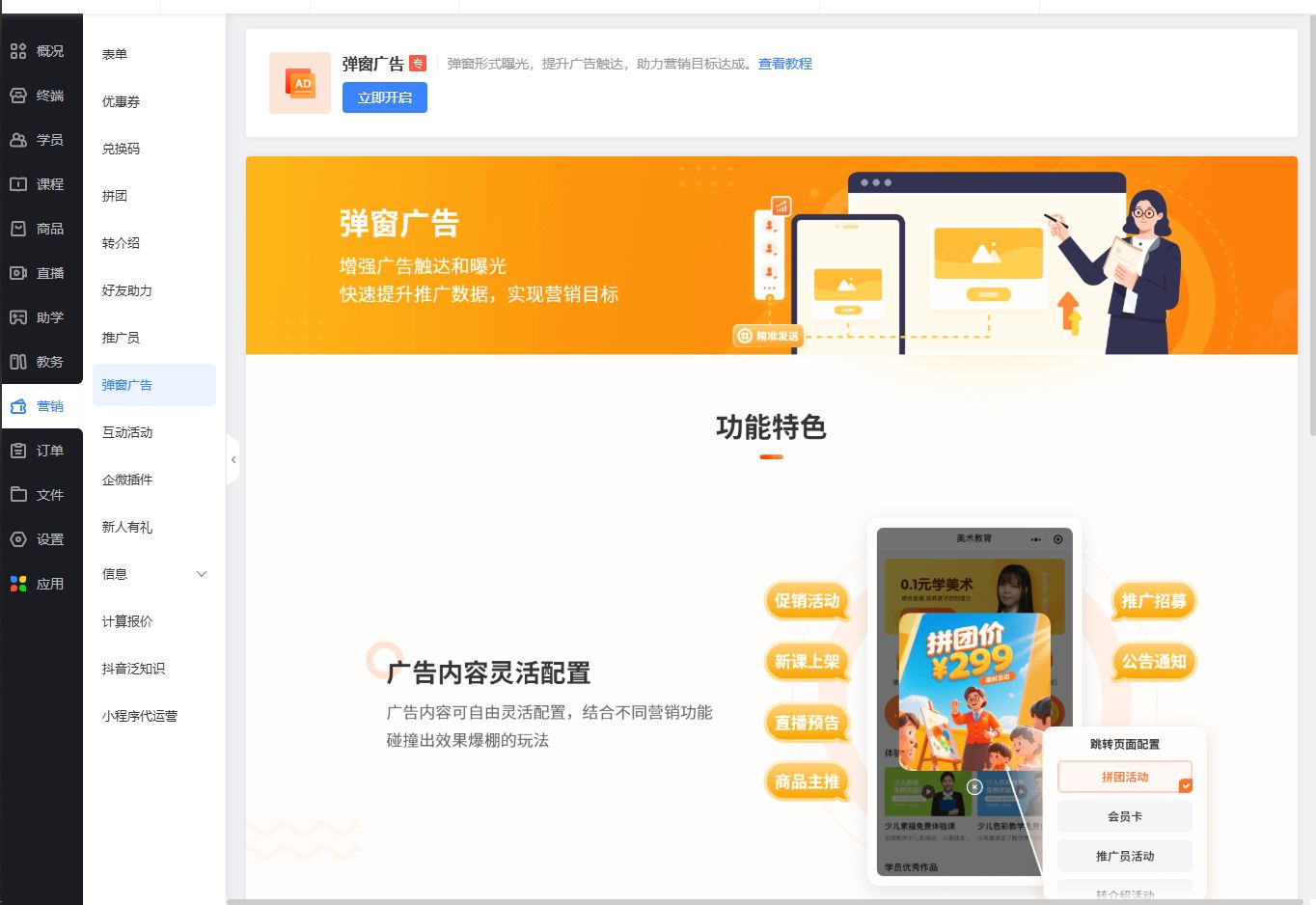 弹窗广告功能是教育系统中用于提升营销效果的核心工具,通过灵活配置弹窗内容、投放规则和受众条件,实现精准广告触达和曝光强化。