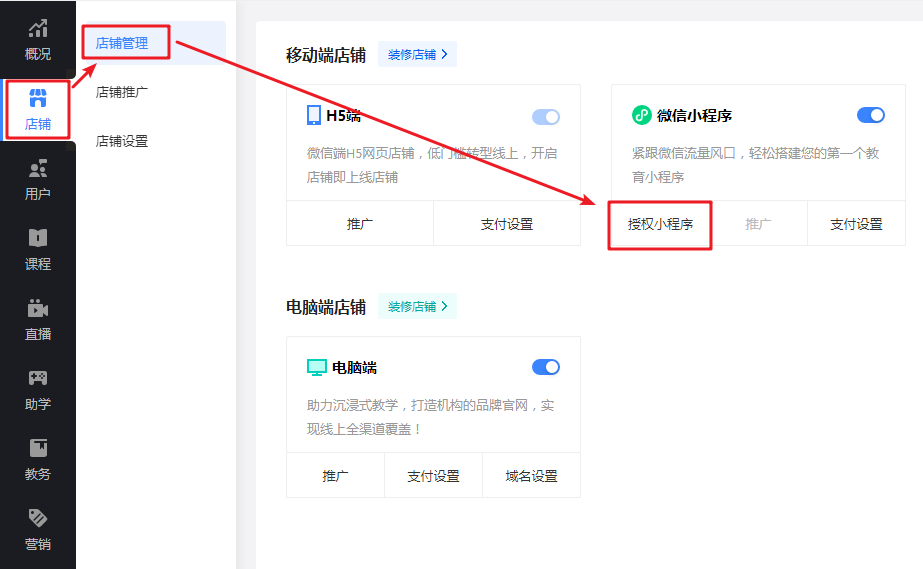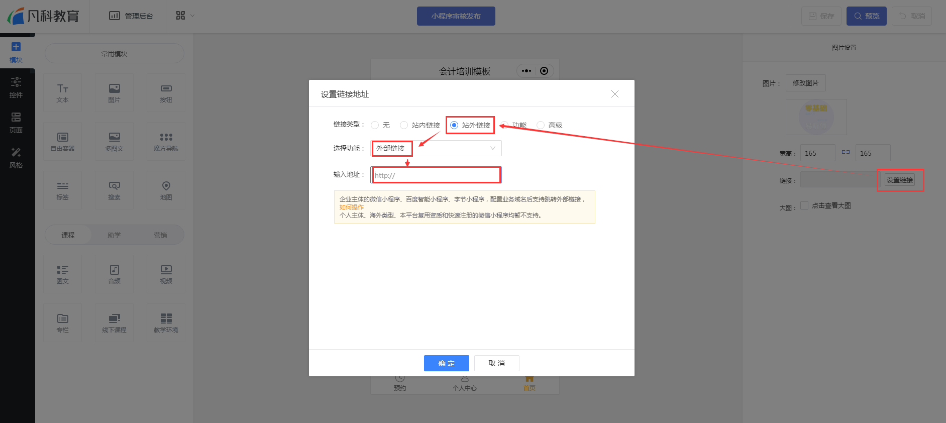 业务域名配置成功后,重新将微信小程序账号授权给教育,然后就可以在教育内设置跳转到外部链接(即配置成功的业务域名)。