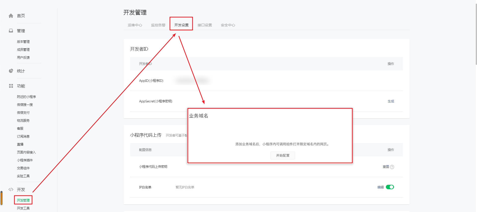 在【开发-开发管理】中找到【业务域名】进行配置。(配置业务域名需小程序管理员扫码验证)