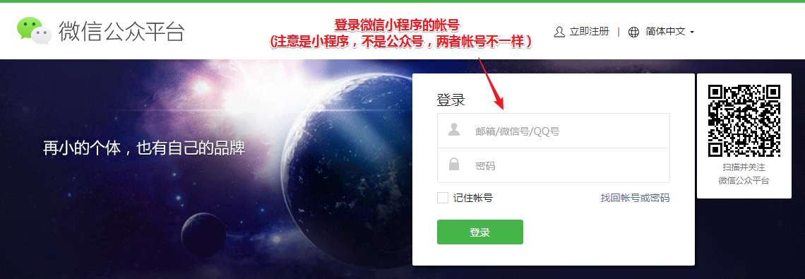 从微信公众平台,登录微信小程序的账号。(注意:是登录小程序,不是公众号,两者账号不一样)