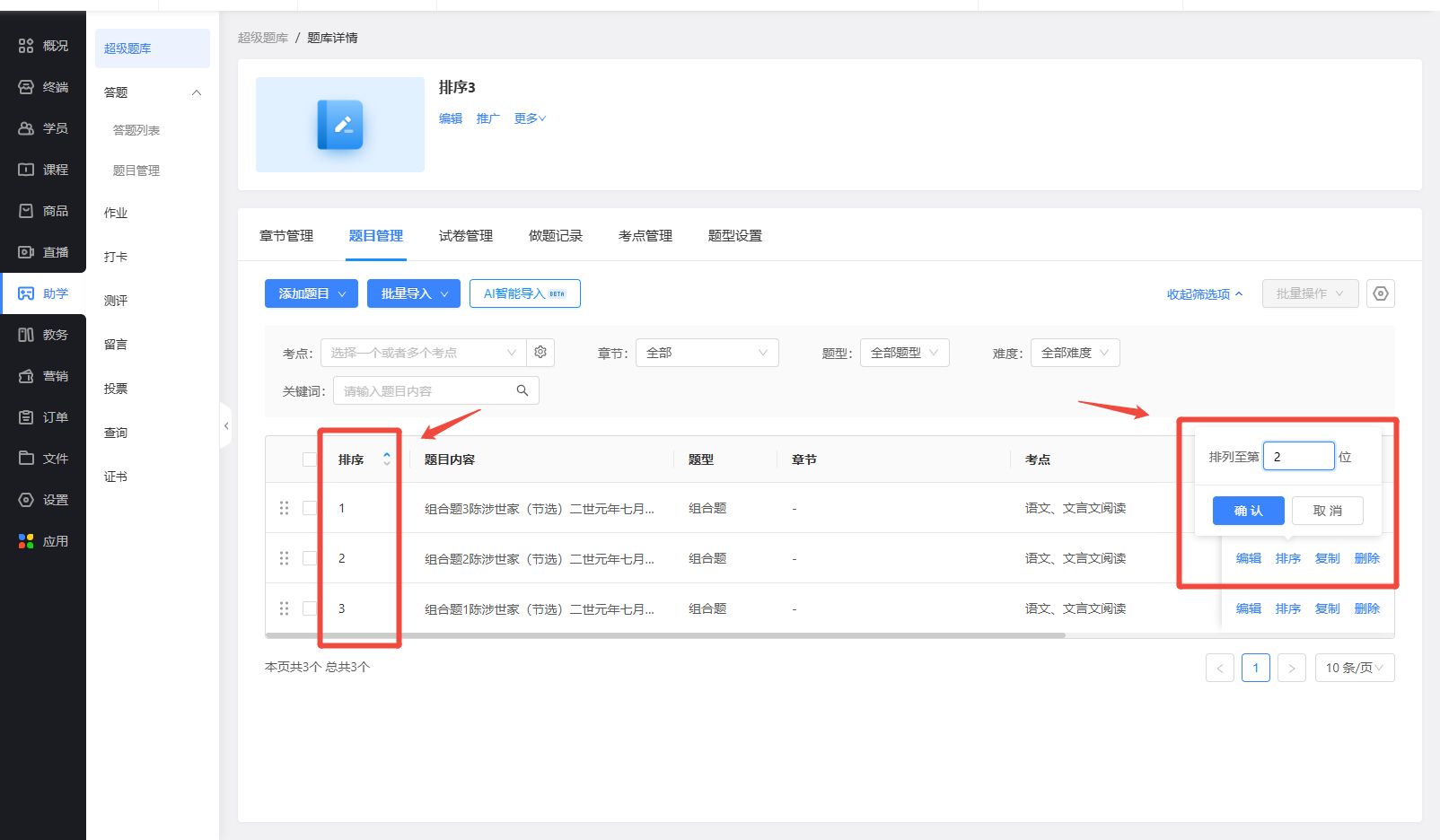 支持通过输入排序数值,调整超级题库的题目列表排序;