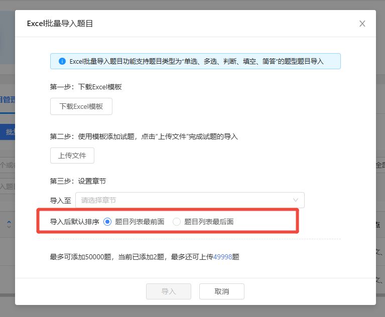 题目导入时,支持勾选默认排在“题目列表前面”、“题目列表后面”;