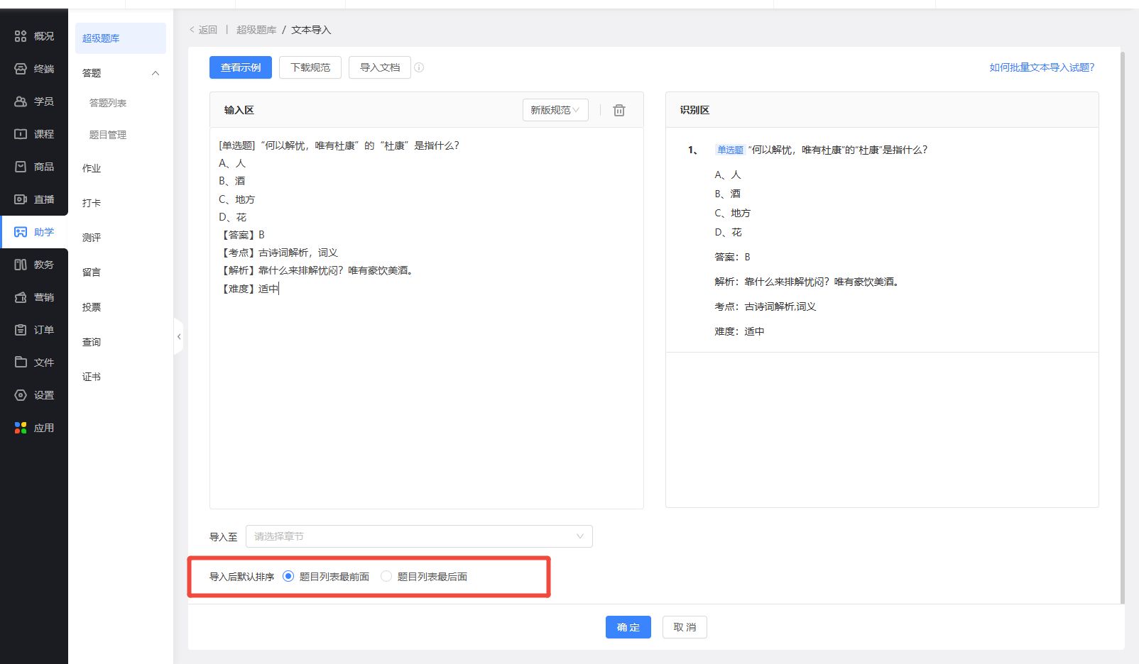 “题目列表前面”:导入后的题目排在题目列表的最前面;