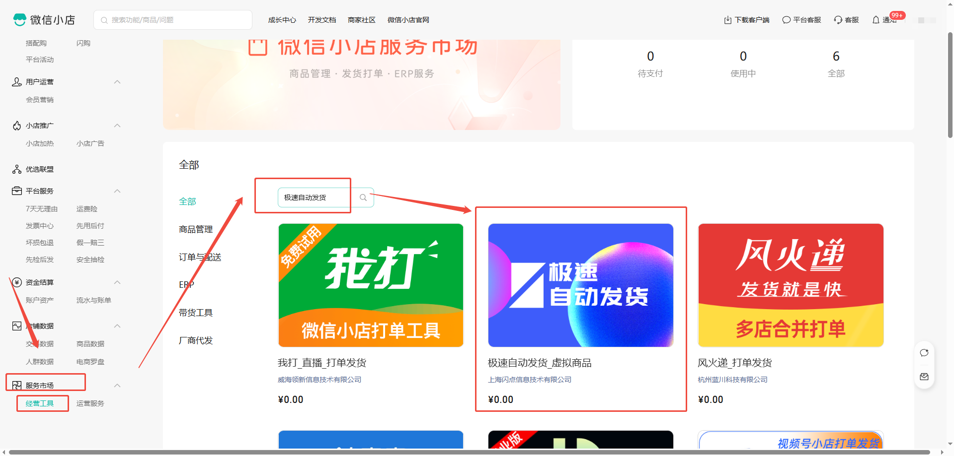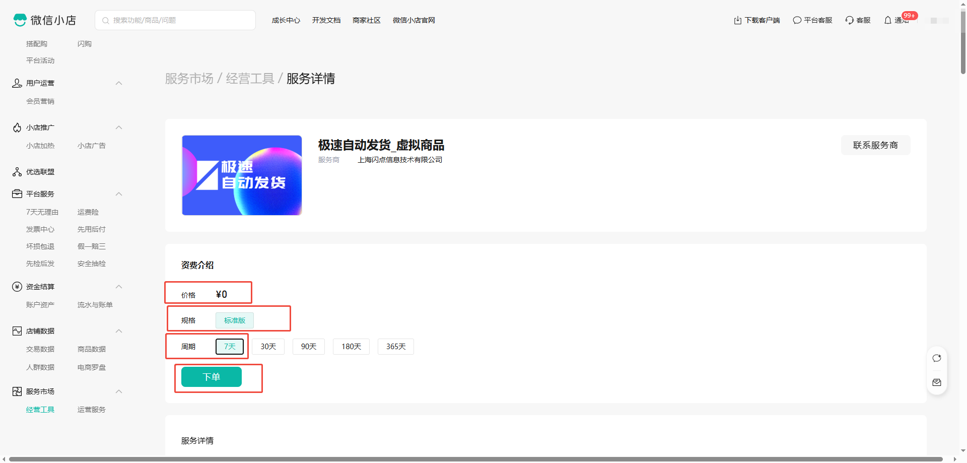 1. 点击微信小店管理后台左侧-服务市场-经营工具,搜索“极速自动发货”,点击进入服务订购,选择标准版,点击【下单】