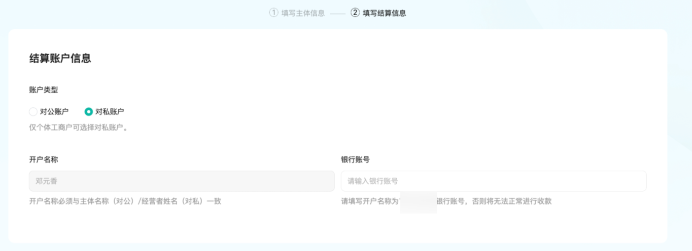 (2)选择对私账户时,开户名称必须与营业执照上的“经营者”信息一致。