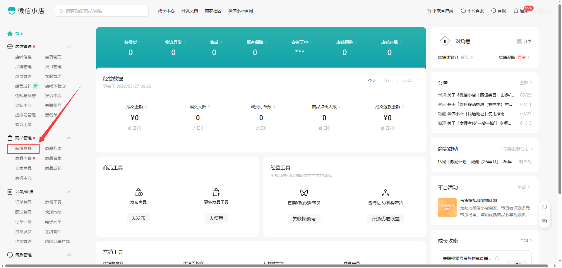 2. 申请教育类目成功后,进入微信小店管理后台,点击左侧菜单栏【创建商品】