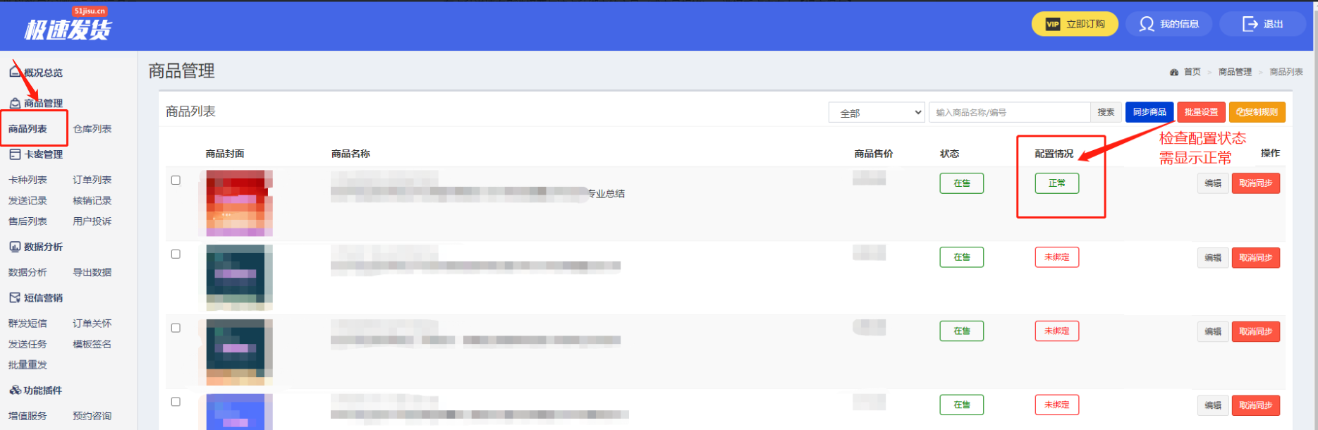 6. 点击左侧菜单【商品列表】,查看刚才绑定的卡种商品状态,需显示正常