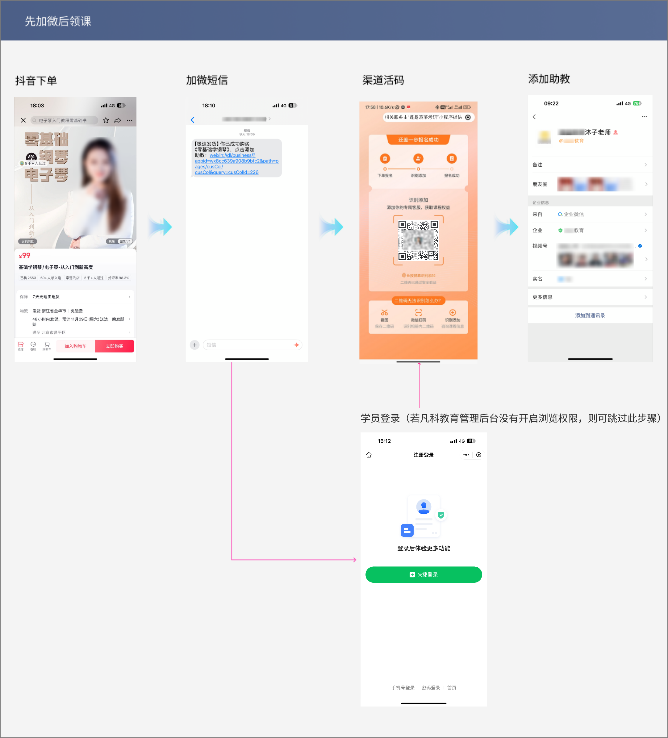 学员下单商品 > 学员点击短信 > 短信自动跳转 > 学员手机登录 > 成功添加客服