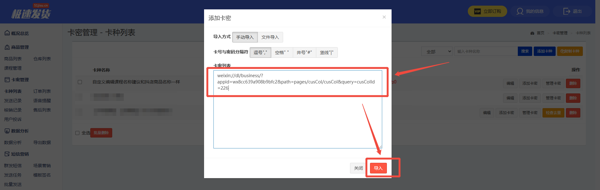 5. 点击【添加卡密】,黏贴【小程序加微链接】,点击【导入】,显示导入成功