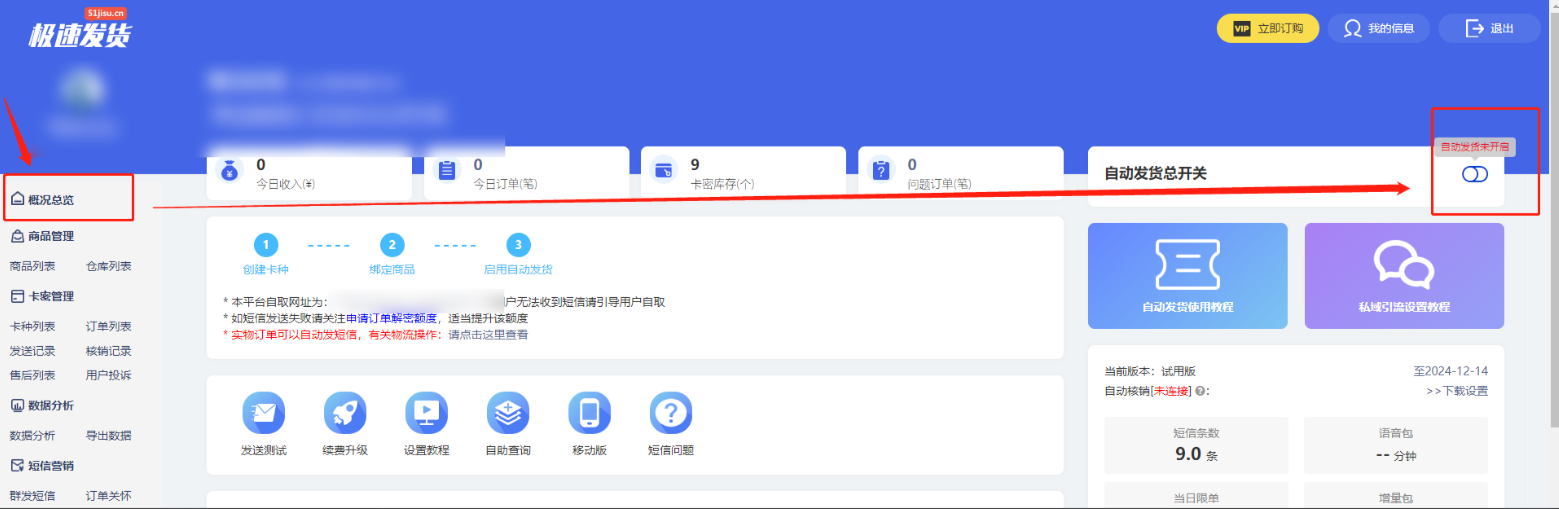 8. 点击左侧菜单【概况总览】,点击右侧【自动发货总开关】,即完成发货配置