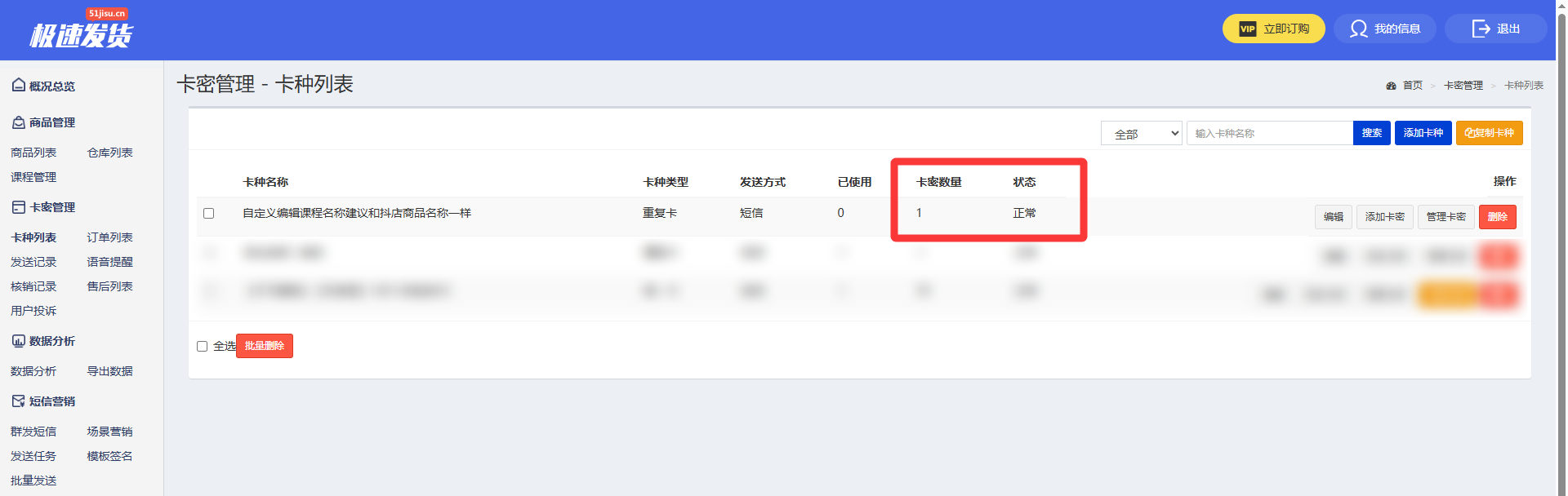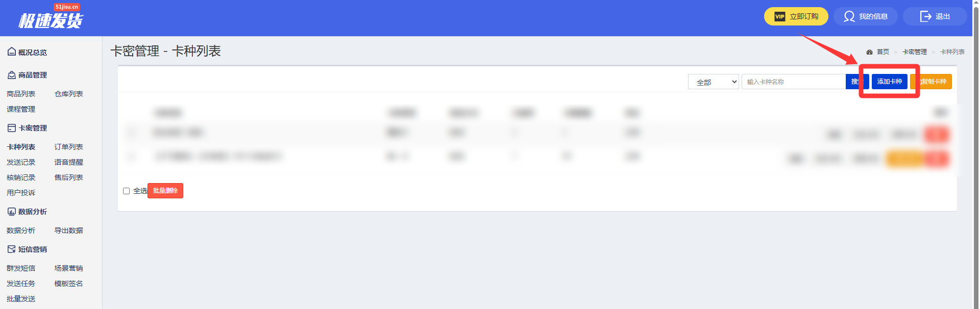2. 点击【授权登录】,进入极速自动发货平台的管理后台,点击左侧菜单栏【卡种列表】